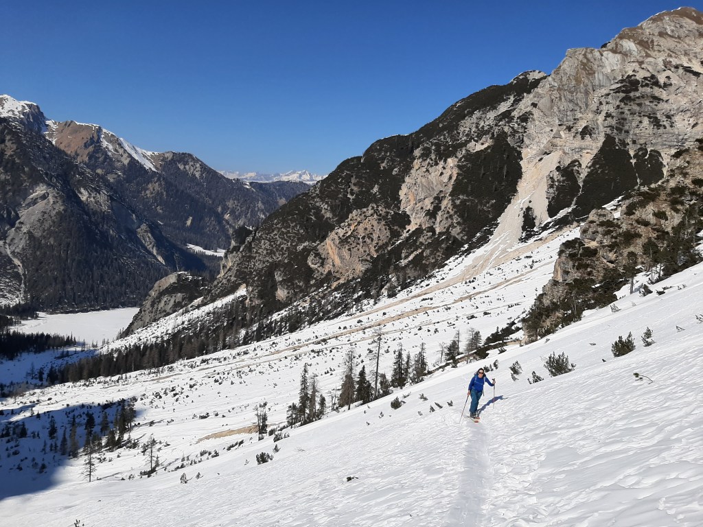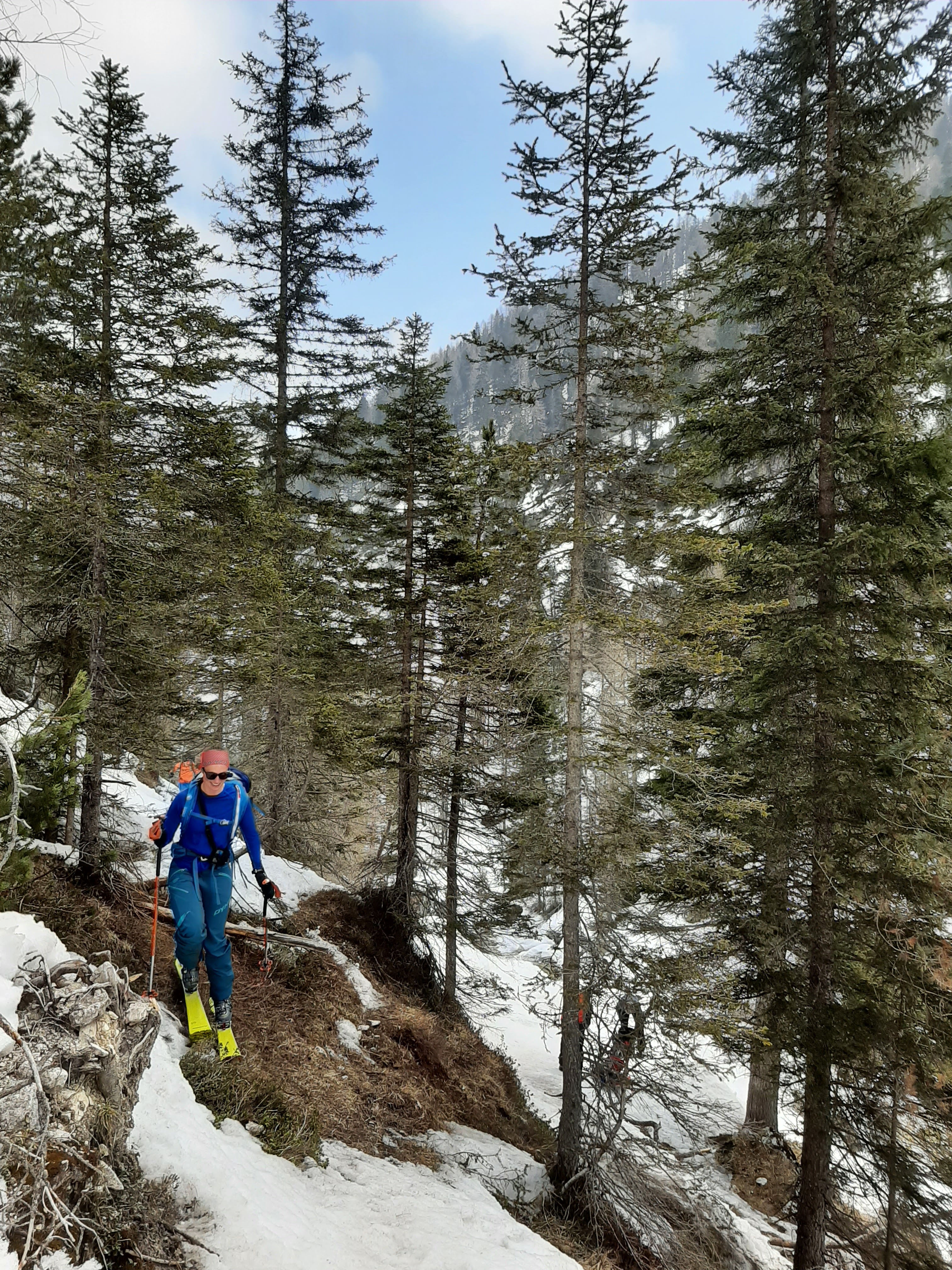 The following day we made a large loop around Seekofel, skiing down to Lago di Braies and climbing back up to Rifugio Bella before completing the loop back to Rifugio Sennes and skiing back to the car, which was parked at the bottom of the forest track beyond Malga Ra Stua. Unfortunately Max niggled his knee on Saturday and wisely decided to not join the day. The snow was generally rubbish – breakable crust at the top, refrozen crud in the middle and heavy saturated snow down below. But the psyche for adventure was high and it was exciting to see the potential for more routes in the area in the future.