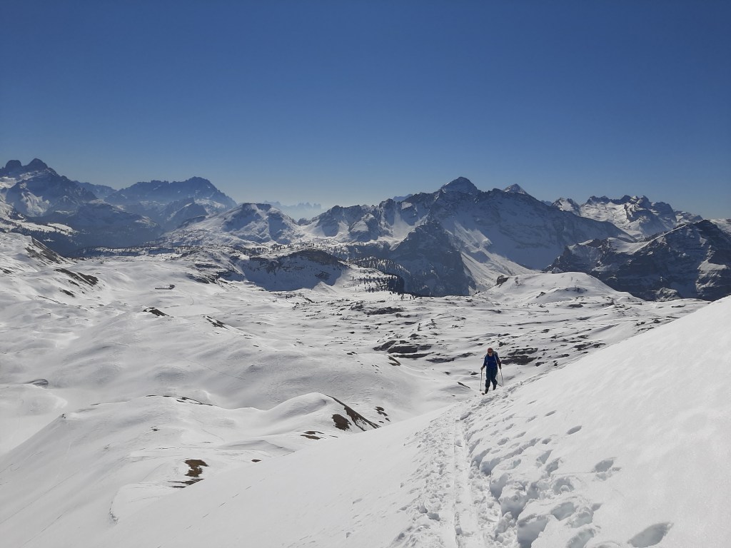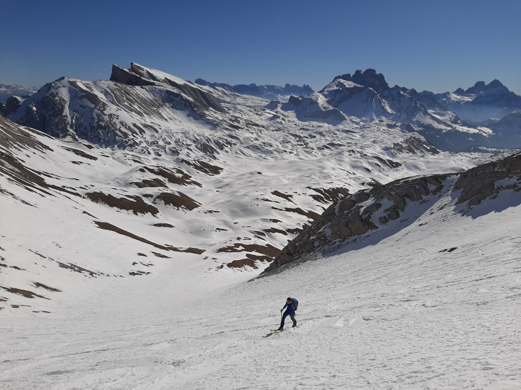 This weekend we planned an overnight stay at Rifugio Sennes, with a tour in Cristallo Group and the Fanes-Sennes-Braies Group each day. Meeting early on Saturday morning in Toblach, we continued south with one car and parked on a hairpin at the start of Val Popena. We were lucky with the weather, but the snow conditions were lacking. This made the ascent up to Forcella Bance (we assumed) somewhat more difficult than normal. The described “small rock step” was longer than expected and the ice pitch more delicate. Once at the saddle, we made the extra effort to reach Monte Cristallino di Misurina for a sandwich and killer views. Back down at the saddle, we prepared ourselves for what looked like some crap snow and a lot of sharks. We weren’t wrong. It was definitely more survival skiing than any sort of enjoyment. The lack of snow lower down made the traverse through the woodland pretty tedious.