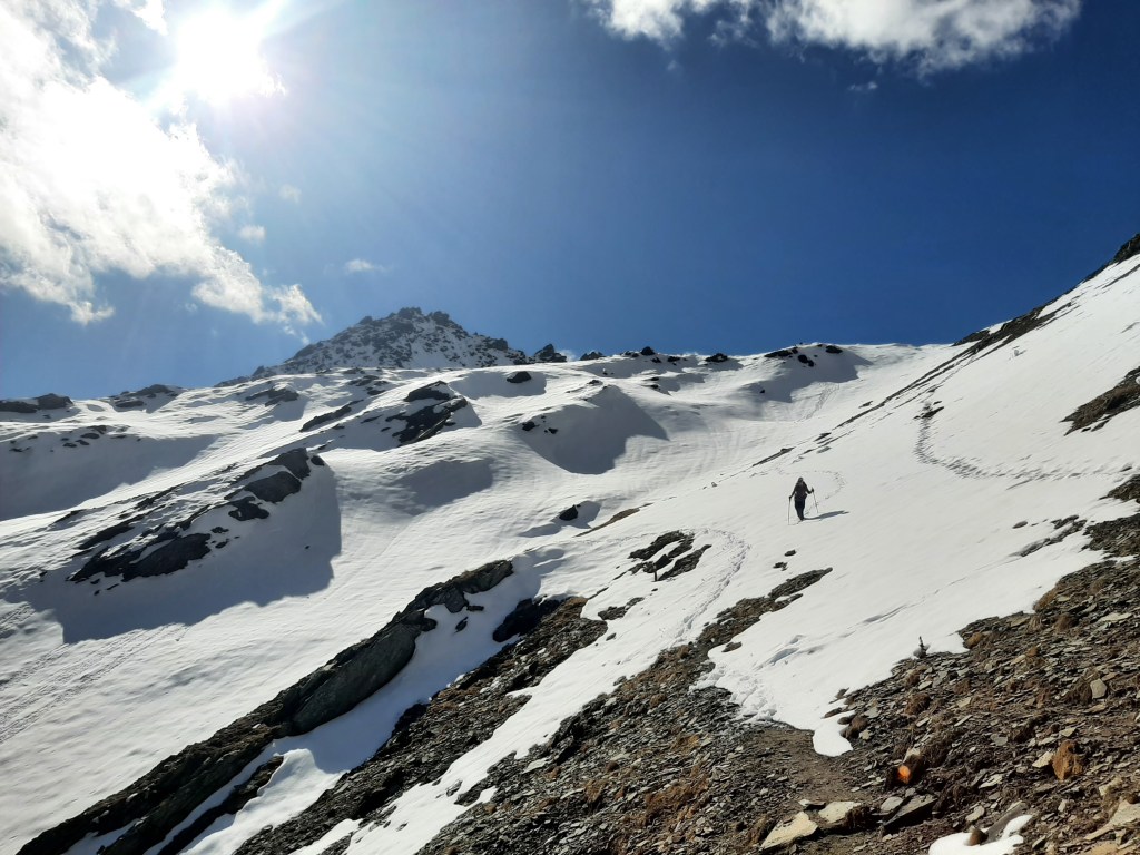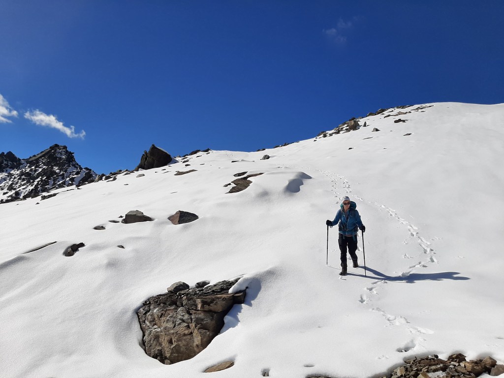 Surrounded by four 3000ers, I had to satisfy my summit-bagging needs. I left Caroline at Hohe Grubenscharte and squirmed along the sugar-snow covered North ridge of Ogasilspitze (3032m). The ridge was an enjoyable grade I/II scramble, made that bit more exciting with old snow that was on occasion much deeper than anticipated. Having taken a bit longer than the 45 minutes I told Caroline, I quickly changed my sopping wet socks, rang what water I could out of my boots, waved them around for a 10 minute air dry, before we made our way to join onto the Alpenkönig trail. This is a remote, high level traverse connecting Clarahütte and Essener Rostocker Hütte.